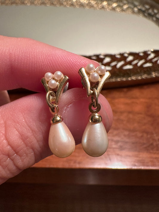 VINTAGE Faux Pearl + Gold Tone Dangly Earrings