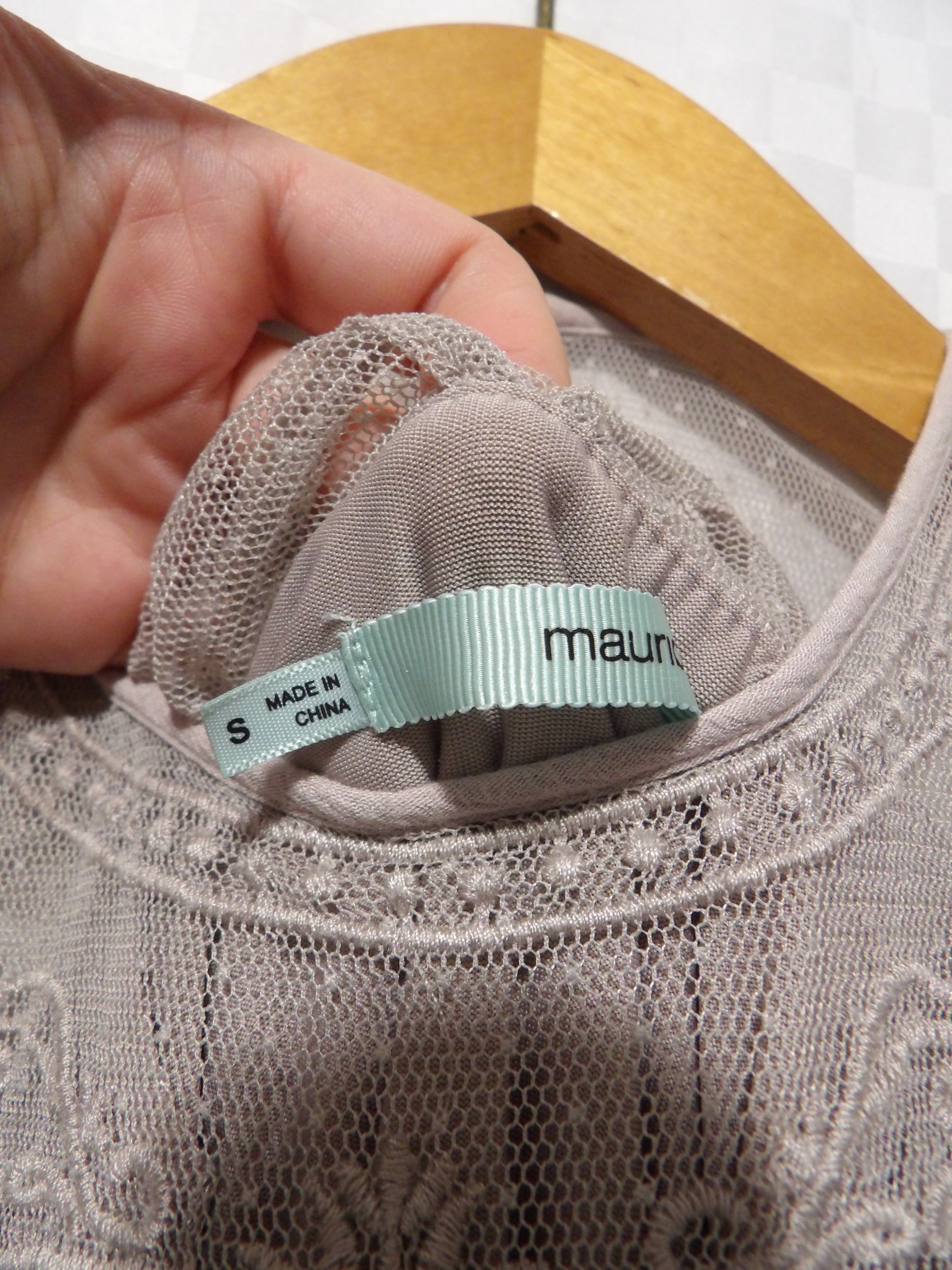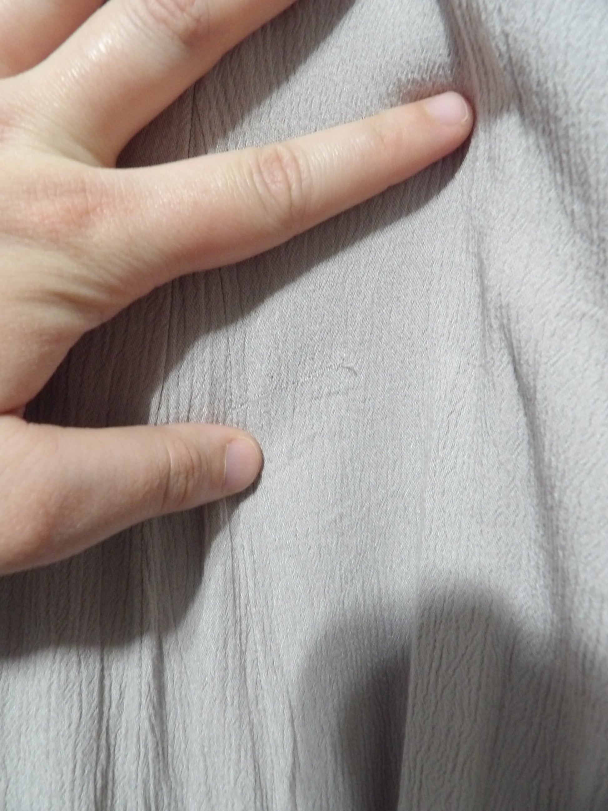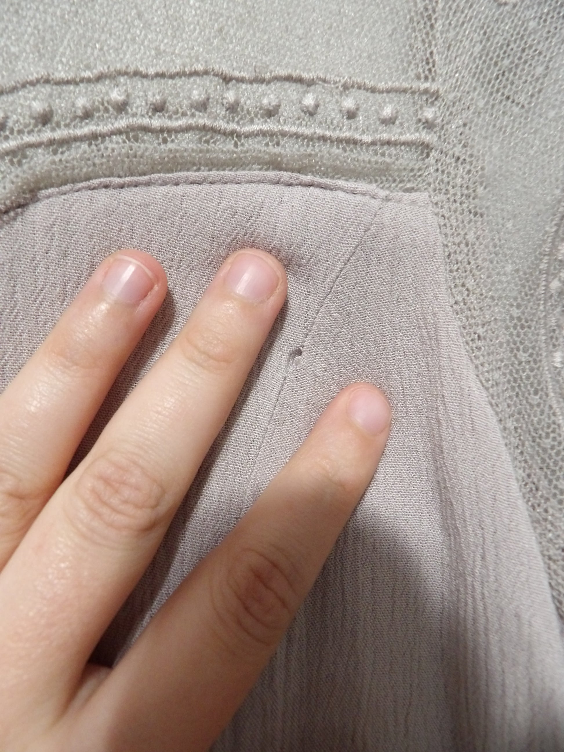 has two small imperfections - one on the seam of the left side breast + one snag on the back, both pictured